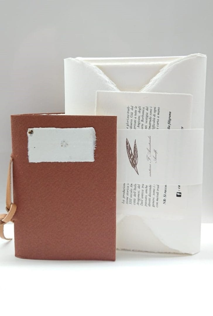 The package contains 10 sheets of paper size 11 x 17 cm. that can be folded by means of a natural water thread positioned in the middle; 10 ivory Amalfi paper envelopes with a classic opening on which it is possible to read the name of the town of Amalfi in watermark, a symbol of the originality of the manufacture and the Amalfi origin; 1 notebook with a colored cover completely made of Amalfi paper and bound by hand with a refined leather strap.