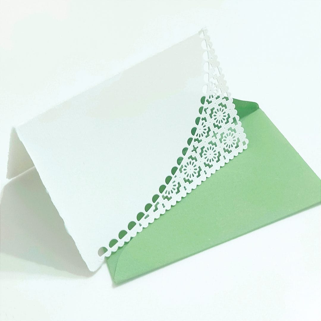 • Folding cards decorated with fretwork of a daisy flower and green colored envelopes in Amalfi paper. Envelope size: 14*9 cm. Card size. 13*8 cm.Folding cards decorated with an openwork of a daisy flower and sepia-colored envelopes in Amalfi paper. Envelope size: 14*9 cm. Card size. 13*8 cm.